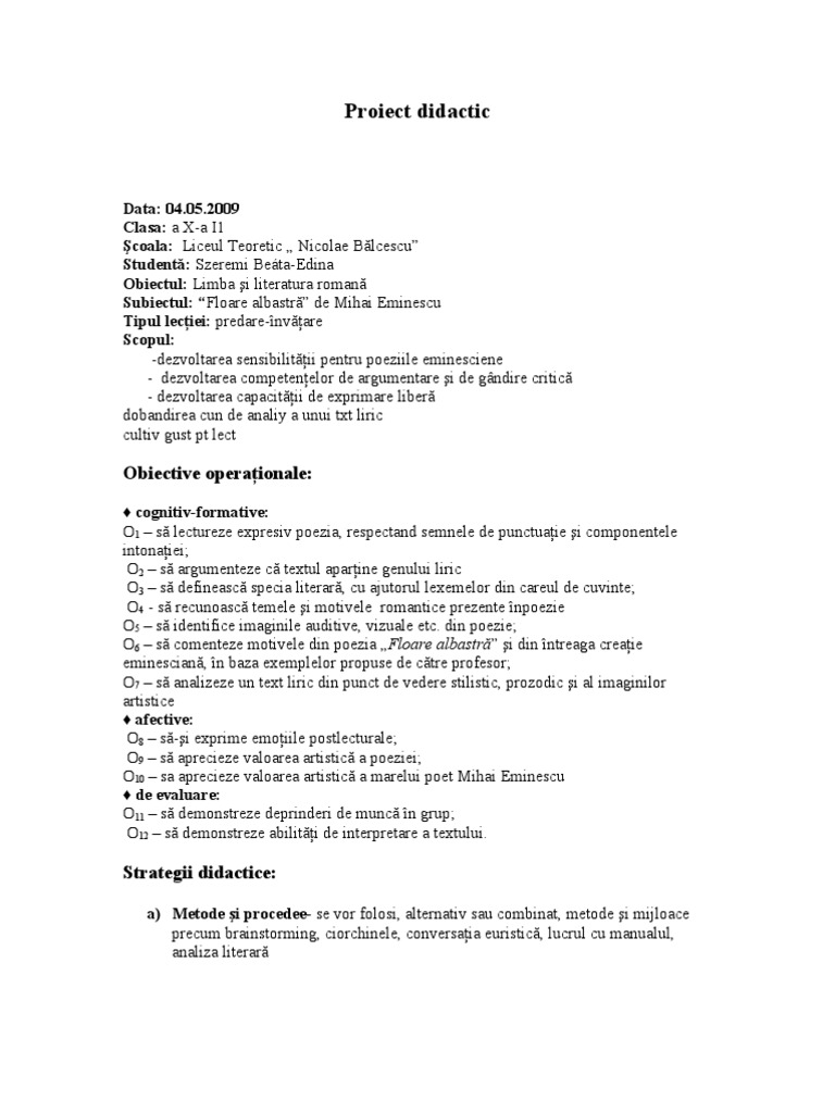 Proiect Didactic Floare Albastra De Mihai Eminescu