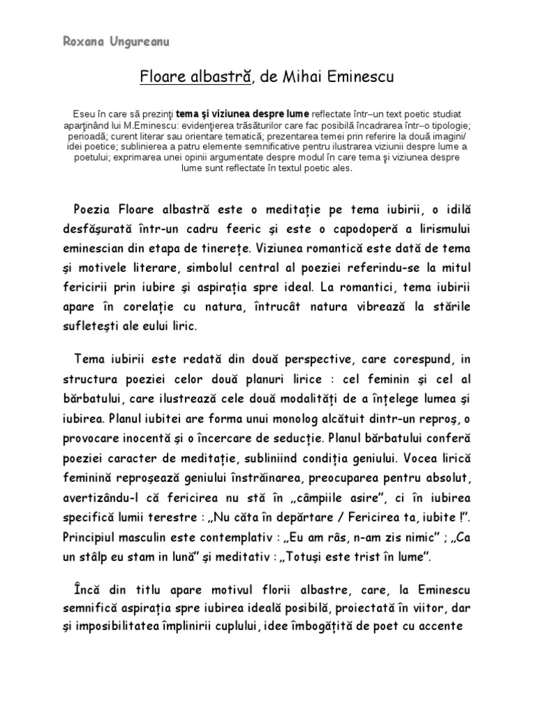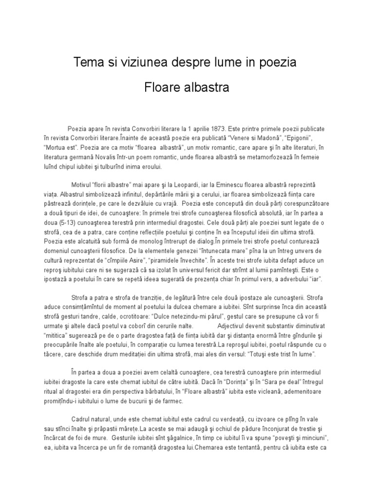 Ci i o meditaie cu rezonane asupra aspiraiei n iubire mihai eminescu dezvoltnd un motiv de circulaie european ntro viziune liric proprie. Salvare salvați floare albastra tema si viziunea despre lume pentru mai târziu. Societatea junimea din care mihai eminescu face parte are un aport.